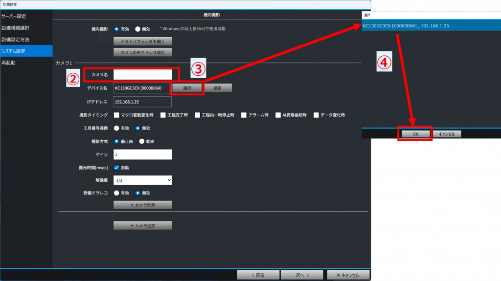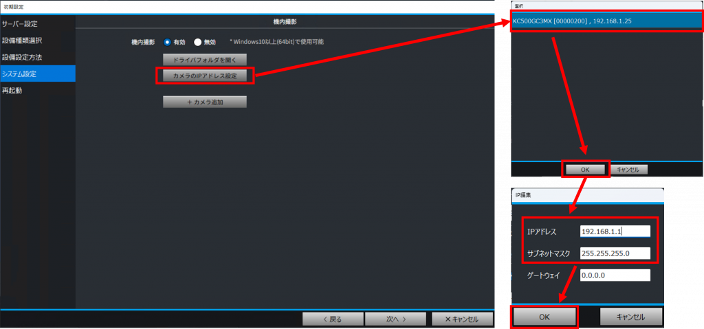 「カメラのIPアドレス」をクリックすると、カメラの選択画面が出てきます。対象のカメラを選択してOKをクリック。IPアドレスとサブネットマスクを設定してOKをクリック。