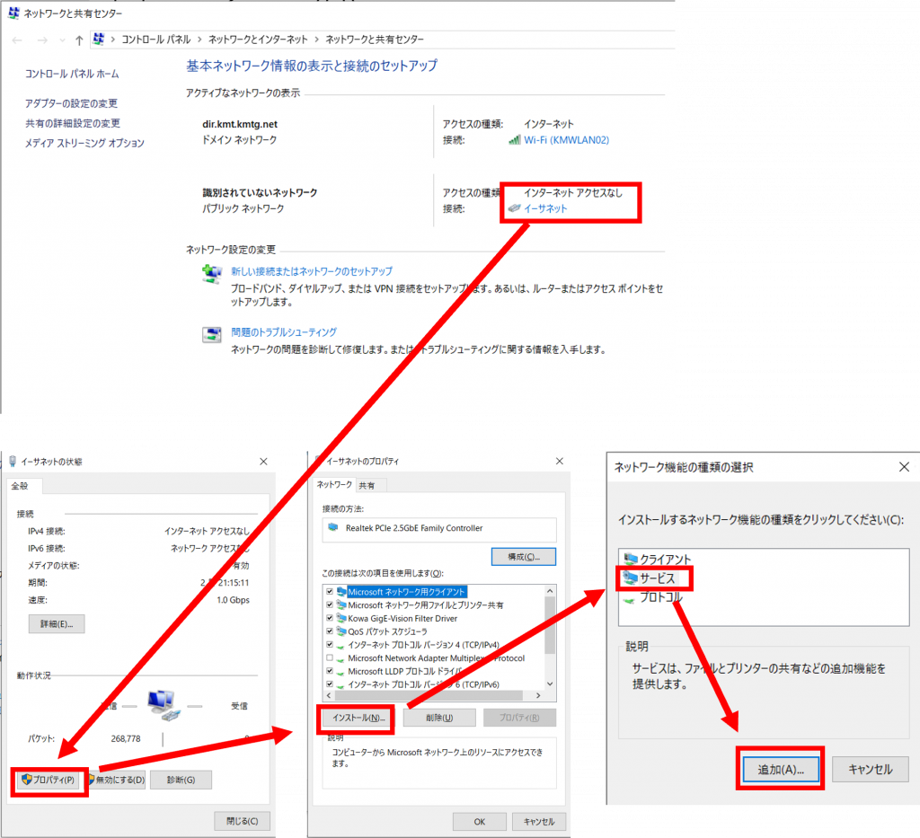 ⑤「イーサネット」→「プロパティ」→「インストール」→「サービス」→「追加」の順に選択します。