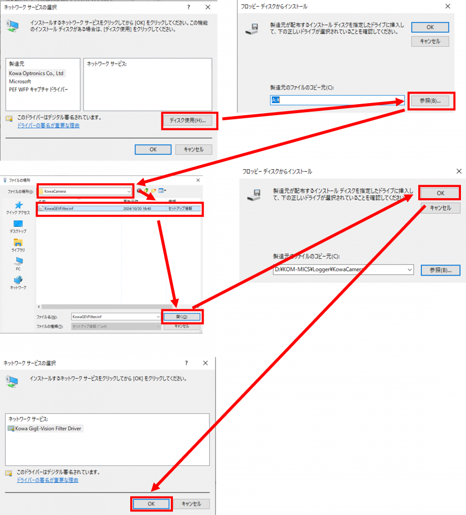 ③でメモしたドライバのフォルダをファイルの場所から選択し、KowaGEVFilter.infを選択し開くをクリックします。