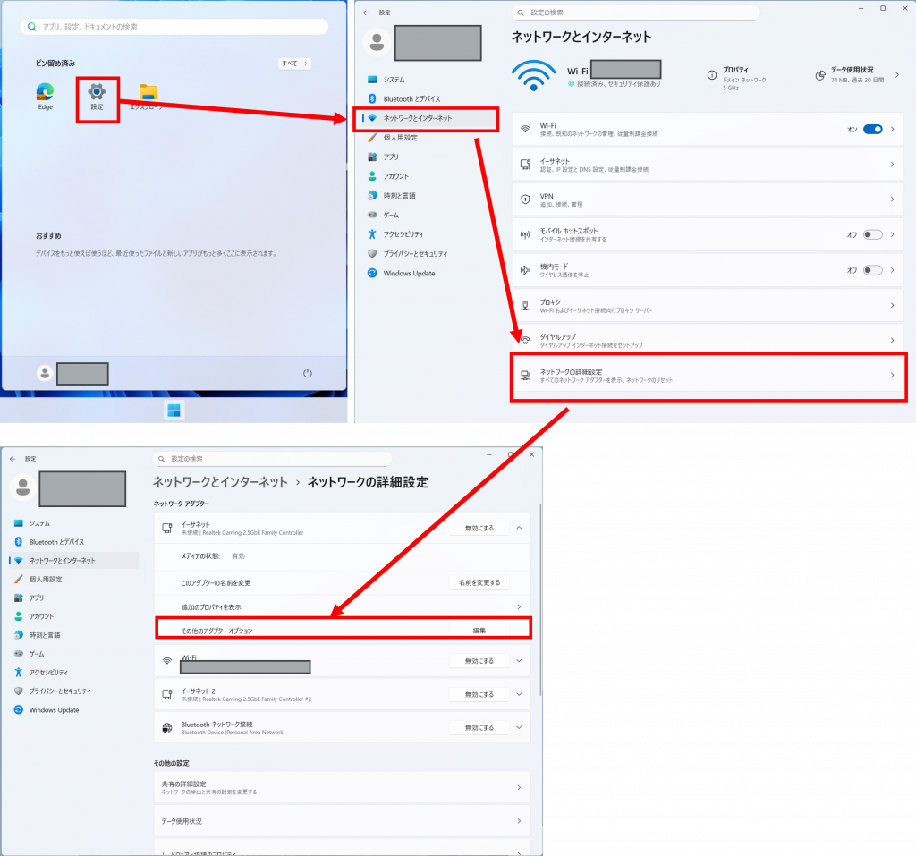 ④「スタート」→「設定」→「ネットワークとインターネット」→「ネットワークの詳細設定」の順に選択します。「イーサネット」の「その他のアダプターオプション」で「編集」をクリックすると、プロパティが開くので、Windows10の⑤と同じようにインストールを進めます。
