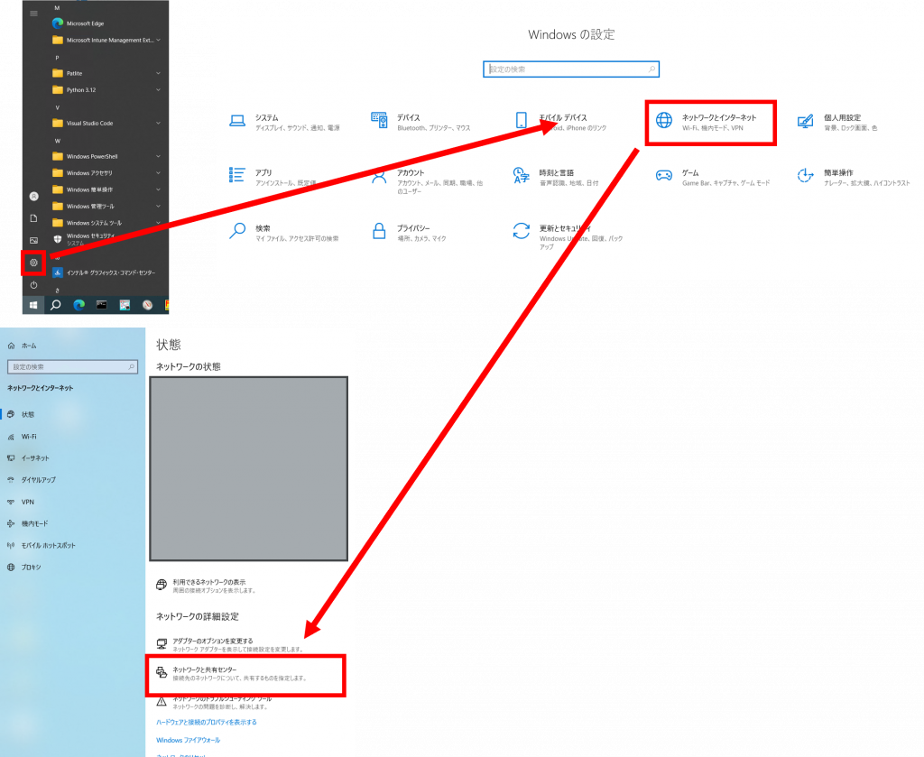 ④「スタート」→「設定」→「ネットワークとインターネット」→「ネットワークと共有センター」の順に選択します。