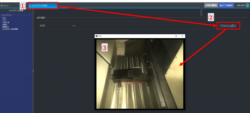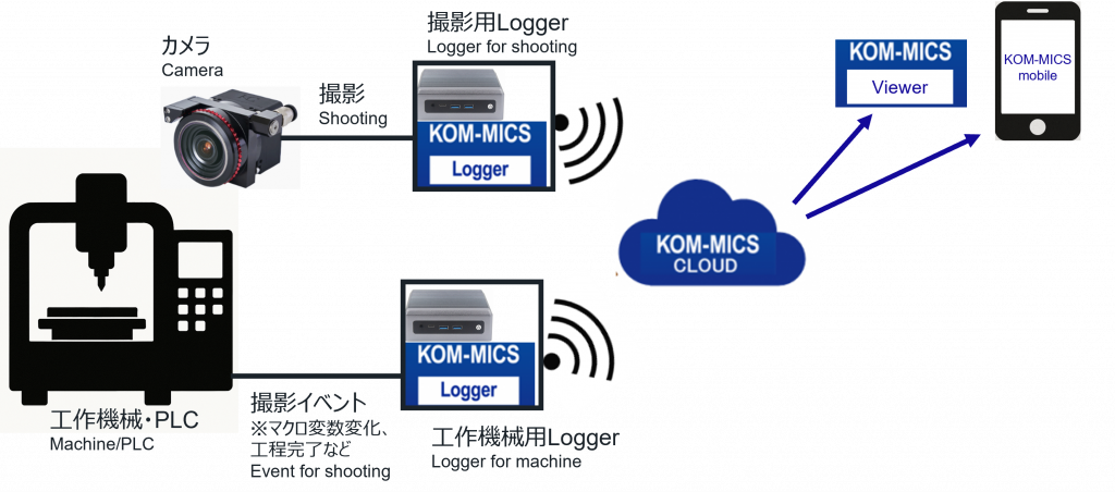 撮影された最新の画像を表示したり、画像に対して異常検知AI、工具摩耗監視、切屑検知といったAI/画像処理を適応したい場合は、KOM-MICS Viewerの「機内撮影」アプリを使用してください。