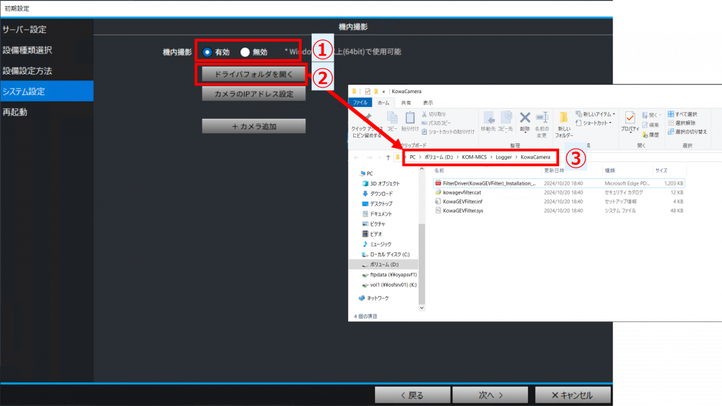 ③機内カメラを使用するためのドライバが入ったフォルダが開きます。フォルダの場所(パス)を確認し、コピーもしくはメモしてください。