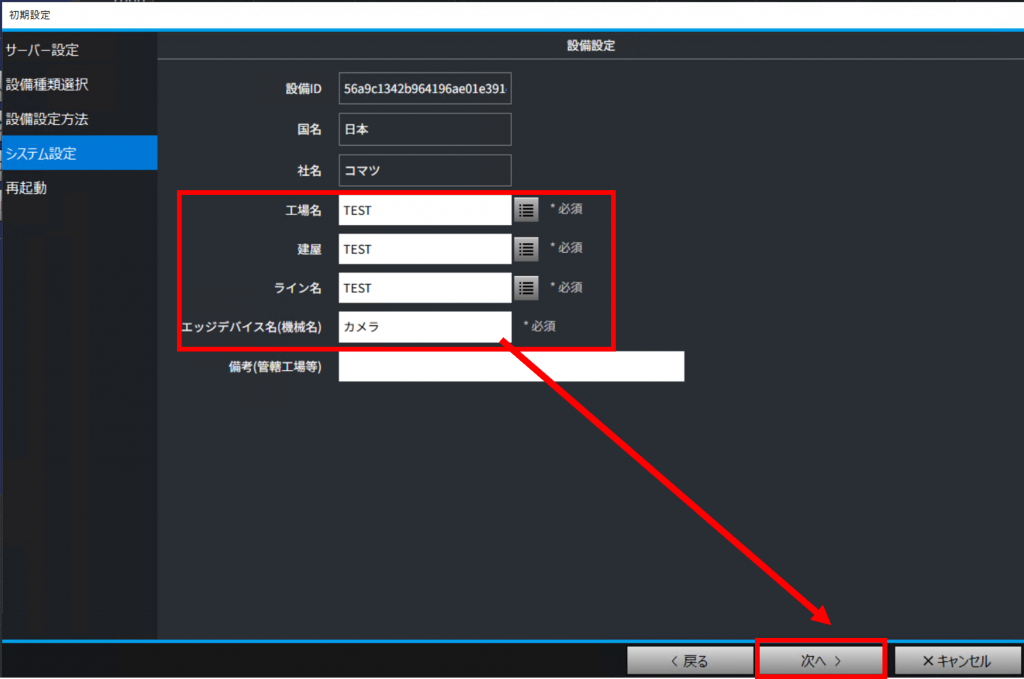 工場名/建屋名/ライン名/エッジデバイス名(この機内カメラに名前を設定)を入力します。
