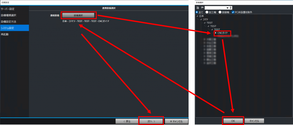 ボタンをクリックして表示された設備選択画面から連絡設備を選択すると、ボタンの下に選択した設備名が表示されます。確認後に「次へ」をクリックします。
