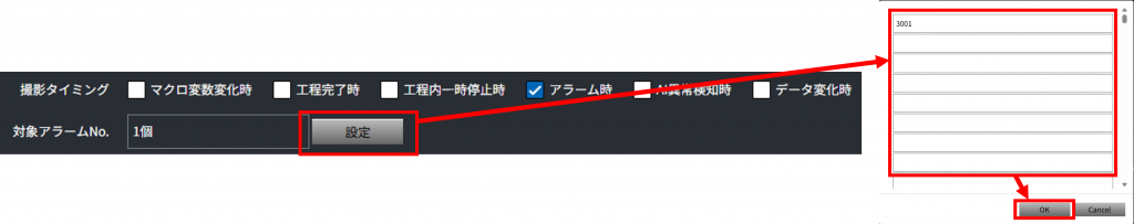 枠が現れるので、アラーム番号を指定します。(複数選択可)