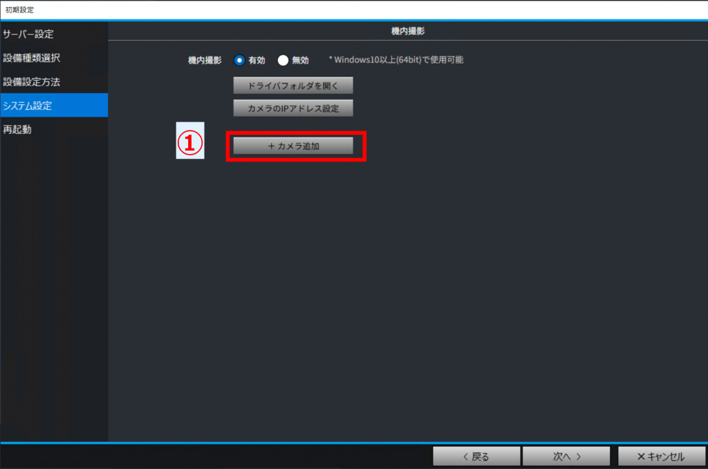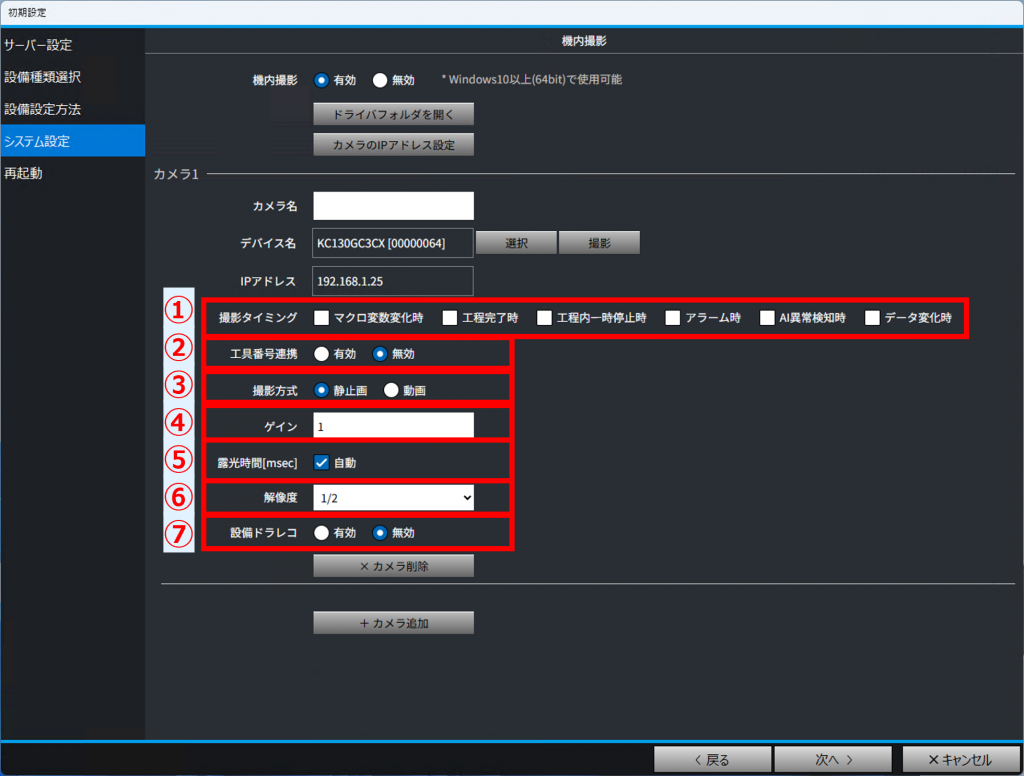 カメラの選択と撮影条件の設定画面が現れます。再度「カメラ追加」をクリックすることで2台目以降のカメラを追加することもできます。