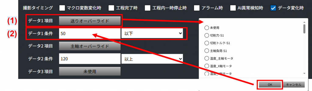 指定したデータが閾値を上回った、もしくは下回ったタイミングで撮影します。