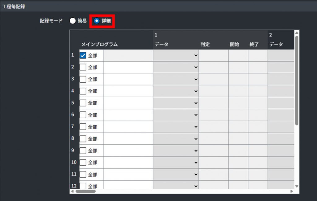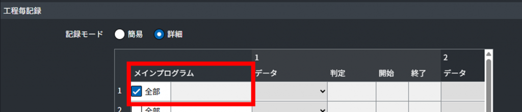 工程毎記録の設定はメインプログラムごとに作成することができます。メインプログラムを指定する場合はその名称を入力してください。特にメインプログラムで区別しない場合は「全部」にチェックを入れることで、全プログラム共通の工程毎記録の設定を作成することができます。
