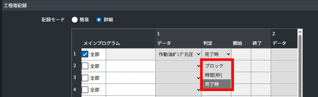工程毎記録のデータ取得タイミングを登録します。判定列をクリックすると、ブロック/時間「秒」/完了時から選択することができ、それぞれは以下のタイミングで取得すること意味しています。