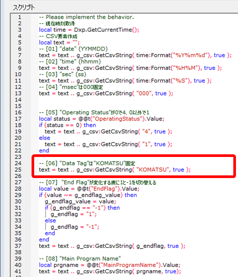 OPCサーバ経由でPLCデータを取得している場合はLoggingスクリプトの[6]”Data Tag”で設定します。各自で社内品or社外品を判定できるアドレス(品番など)を用いて、社内品の場合は「KOMATSU」が入力され、社外品の場合は何も入力されないというコードをLoggingスクリプトの[6]”Data Tag”の所に書いてください。